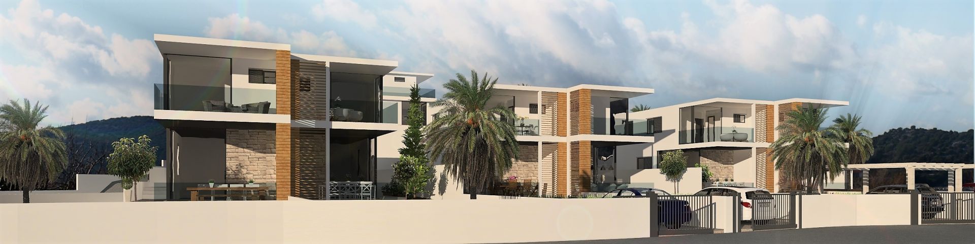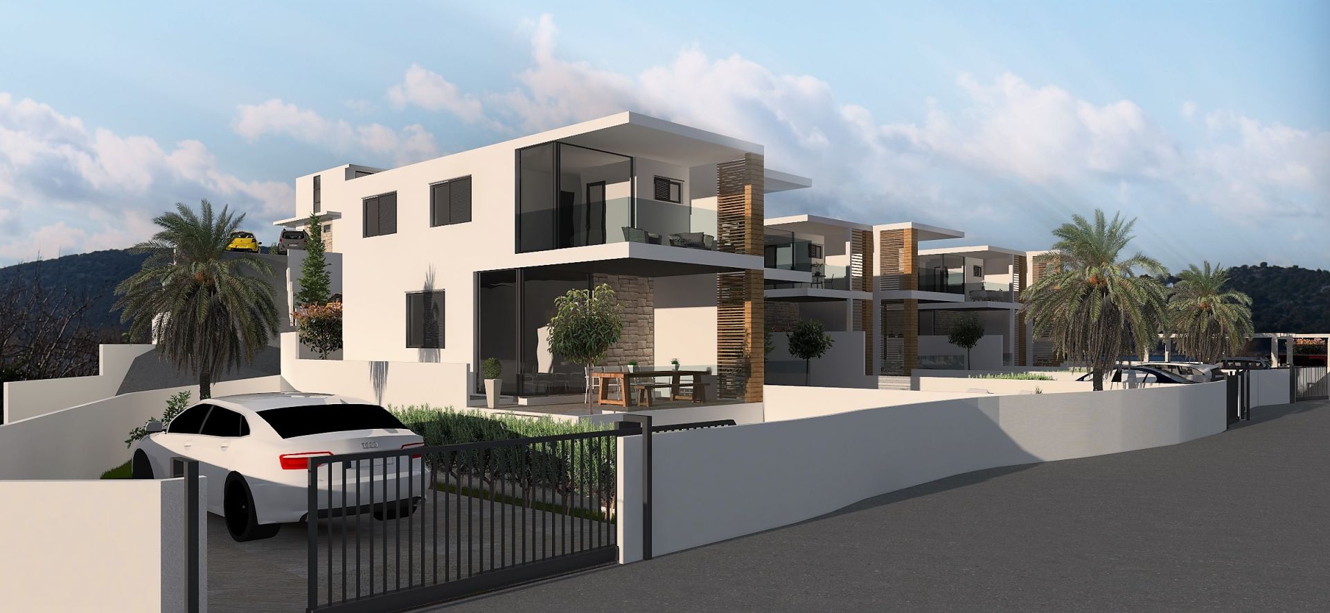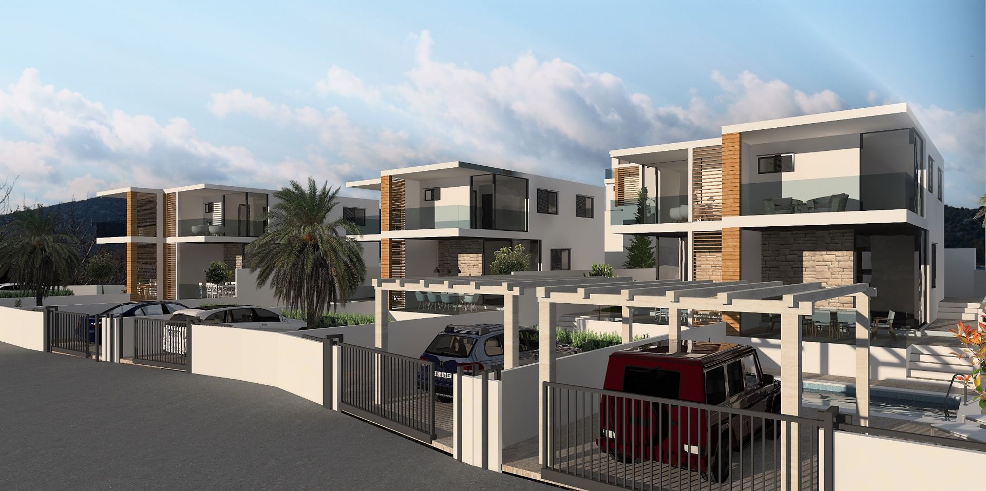 Project plan consist of 6 semi-detached houses and 2 individual houses. Houses will feature contemporary and elegant design with planed white or sandy exterior colour with anthracite floor to ceiling windows for calm and harmonious design.